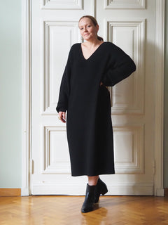 Todellista tulevaisuuden vintagea: Väljä ja kauniisti laskeutuva midimittainen neulemekko pehmeästä 100 % merinovillaneuloksesta. Mekossa on v-pääntie ja kokopitkät hihat, sekä halkio helmassa vasemmalla puolella.